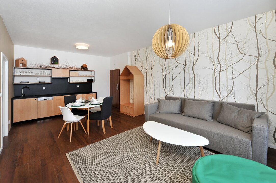 Apartmány 4+2 sú mezonetové apartmány s otvorenou galériou s manželskou posteľou pre 2 osoby, s dolným priestorom so spálňou, obývacou izbou a kuchynkou.