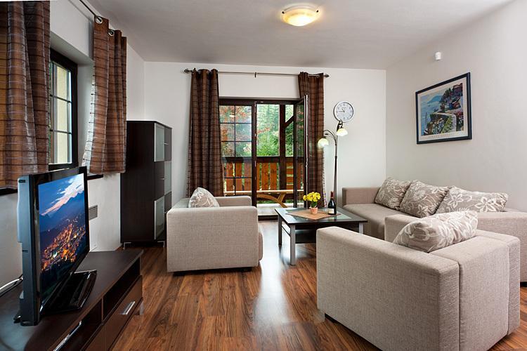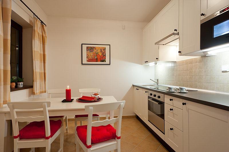 Moderné apartmány majú kompletne vybavenú kuchyňu, obývaciu izbu s posedením a satelitnou TV s plochou obrazovkou a vlastnú kúpeľňu s podlahovým vykurovaním. Všetky apartmány majú k dispozícii parkovanie s kamerovým systémom.