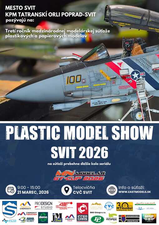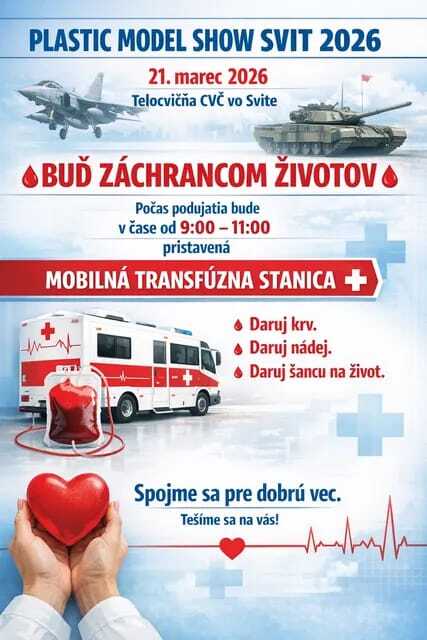 3. ročník modelárskej súťaže „PLASTIC MODEL SHOW SVIT 2026“ sa bude konať dňa 21.3.2026 v telocvični a CVČ Svit od 9,00 hodiny. Tak neváhajte a príďte sa pozrieť do Svitu na krásne práce modelárov žiakov, juniorov i seniorov. Novinkou bude tiež sprievodná akcia „Buď záchrancom životov“, kedy pre darcov krvi bude pristavená mobilná transfúzna stanica v čase od 9:00 do 11:00 hod..