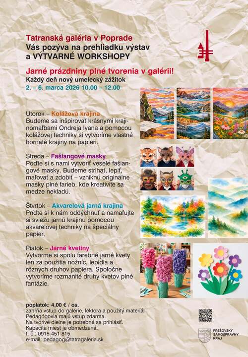 Strávte jarné prázdniny kreatívne v Tatranskej galérii. Pripravili sme pre Vás týždeň plný farieb, fantázie a tvorivosti. Každý deň objavíme novú techniku a vytvoríme si vlastné umelecké výtvory.