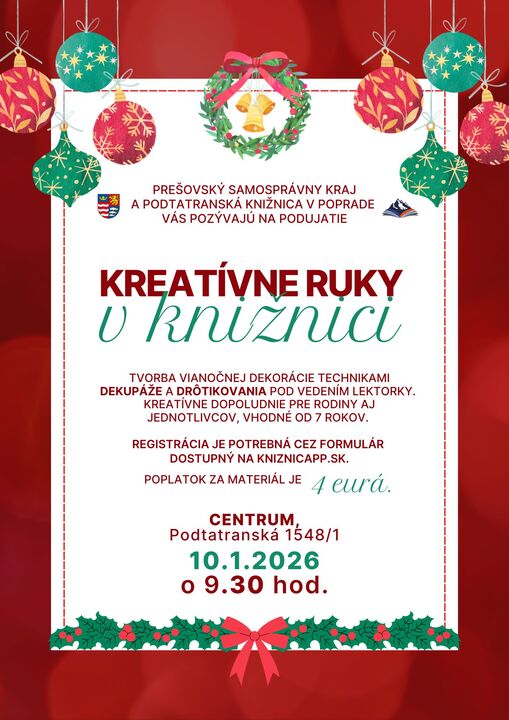 Kreatívne dopoludnie pre rodiny aj jednotlivcov, vhodné od 7 rokov. Registrácia je potrebná cez formulár dostupný na kniznicapp.sk. Poplatok za materiál je 4 eurá.