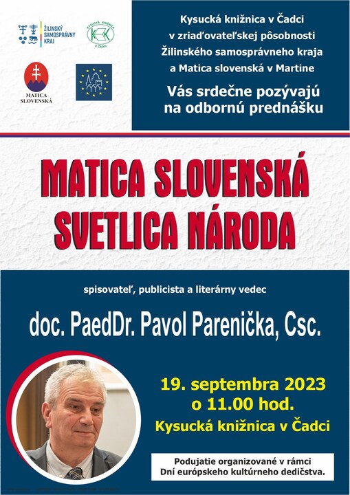 Kysucká knižnica v Čadci v spolupráci s Maticou slovenskou v Martine Vás srdečne pozýva na odbornú prednášku „Matica slovenská svetkica národa“ slovami spisovateľa, publicistu a literárneho vedca Doc. PaedDr. Pavla Pareničku, Csc.dňa 19. septembra 2023 o 11. 00 hod.