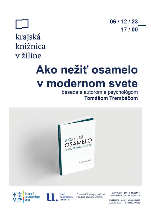Pozývame vás na inšpiratívnu besedu s autorom Tomášom Trembáčom. Psychológ s 15-ročnou praxou, vám ukáže jednoduché a účinné metódy, ako zvládať stres v kontakte s novými ľuďmi, rozvíjať svoje záľuby a ovplyvniť dojem, ktorý na ostatných zanechávate. Pridajte sa k nám a objavte cestu ku kvalitnejšiemu spoločenskému životu v stredu 6. decembra o 17:00 v Krajskej knižnici v Žiline. Podujatie z verejných zdrojov podporil Fond na podporu umenia.