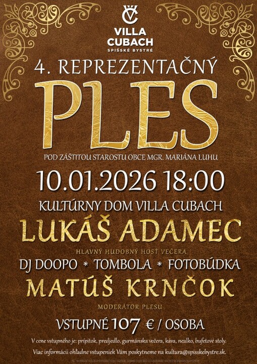 Príďte sa zabaviť na 4. Reprezentačný ples pod záštitou starostu obce Spišské Bystré Mgr. Mariána Luhu, do našich krásnych priestorov Villa Cubach! Čaká vás skvelé jedlo, DJ Doopo, fotobúdka, tombola a atmosféra, na ktorú nezabudnete.