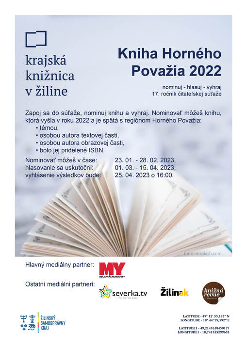 Krajská knižnica v Žiline v zriaďovateľskej pôsobnosti Žilinského samosprávneho kraja v spolupráci s regionálnymi novinami MY Žilina ako hlavným mediálnym partnerom a ďalšími partnermi: Žilinak, TV Severka a Knižná revue, vyhlasuje 17. ročník čitateľskej súťaže Kniha Horného Považia 2022.