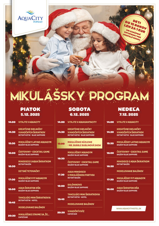 Počas celého Mikulášskeho víkendu navyše platí špeciálna akcia – deti za 1 €! Podmienkou je zakúpenie vstupu pre 1 dospelú osobu na pokladniach v AquaCity Poprad alebo online cez eshop. A to nie je všetko – v sobotu 6. decembra sa môžete tešiť aj na obľúbeného Mr. Bubble, ktorý svojou šou s obrovskými bublinami vykúzli úsmevy na detských tvárach a postará sa o nezabudnuteľnú atmosféru.