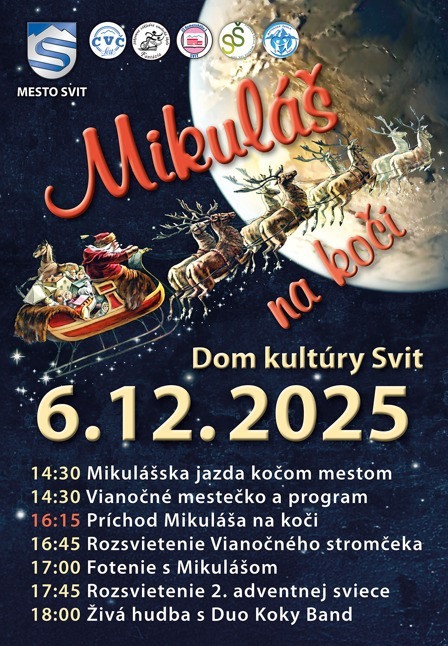 V sobotu 6. decembra 2025 sa môžete tešiť na Mikulášsku jazdu kočom, rozsvietenie stromčeka, vianočné mestečko a program Svitovských škôl pre celú rodinu.
