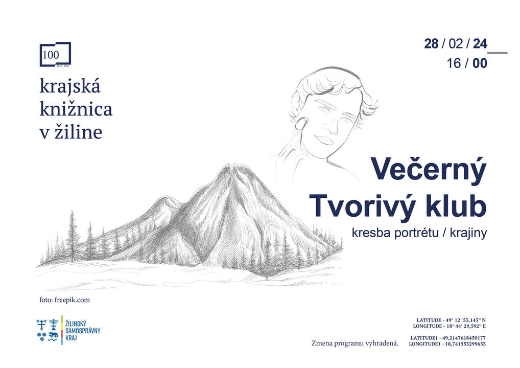Prvé stretnutie večerného tvorivého klubu bude v stredu 28. februára o 16:00 v Krajskej knižnici v Žiline na tému Kresba portrétu alebo krajiny.