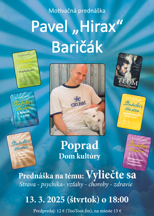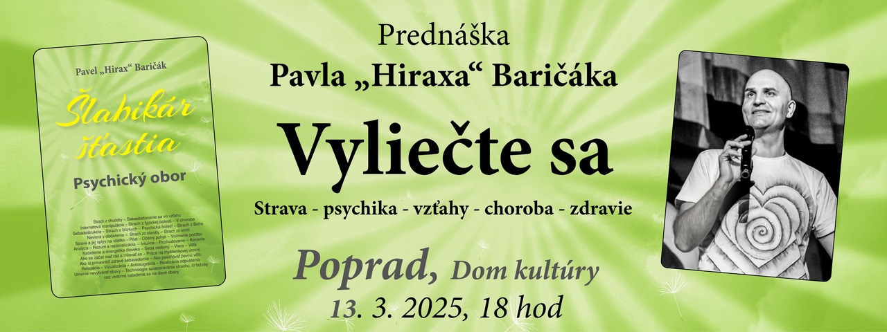 Pavel Hirax Baričák bude rozprávať o následkoch nevhodnej životosprávy a deštruktívnych psychických vzorcov na naše zdravie ako aj o možnostiach riešenia a ceste ku zdraviu.