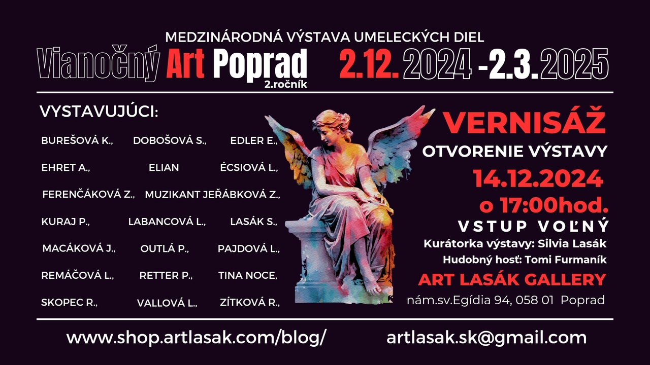 We cordially invite you to the opening of the exhibition, vernissage, international exhibition of artworks entitled CHRISTMAS ART POPRAD, where 20 artists from Slovakia and the Czech Republic will present their works in the premises of the ART LASÁK GALLERY in Poprad on December 14, 2024 at 5:00 p.m., at nám.sv. Egídia 94.