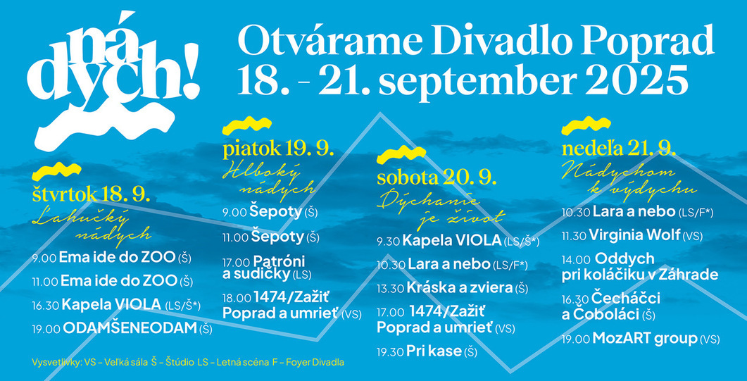 Divadelný sviatok bude prebiehať v dňoch 18. – 21. septembra 2025. Program predstavíme postupne. Ponúkneme vystúpenia zahraničných hostí, inscenácie pre dospievajúcich a dospelých, programy pre rodiny s deťmi, premiérové uvedenia prvej inscenácie napísanej pre Divadlo Poprad.