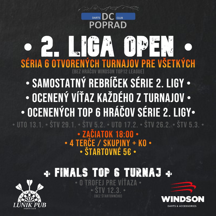 Turnaje série 2. LIGA OPEN sú OPEN = otvorené pre všetkých mimo hráčov hrajúcich Windson TOP12 league III. Podmienkou pre ocenenie a postup do FINALS TOP 6 turnaja sú odohrané minimálne 3 turnaje série.
