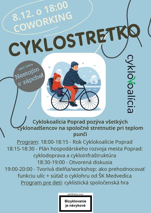 Pripravený bude zaujímavý program, diskusia o cyklodoprave a príjemná atmosféra s vianočným punčom. Vidíme sa v Coworkingu, 8.12. (pondelok) o 18:00 ❄️🎄