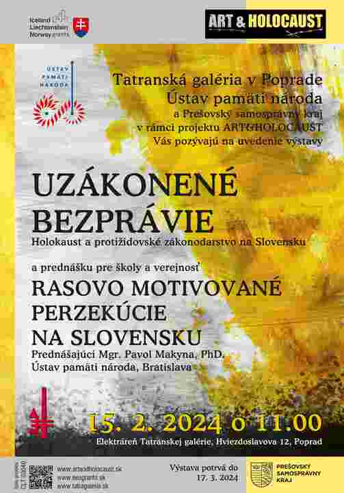 V rámci nášho projektu Art&Holocaust vás pozývame na prednášku s názvom Rasovo motivované perzekúcie na Slovensku, ktorá sa uskutoční vo štvrtok 15. februára 2024 o 11.00 h v Tatranskej galérii v Poprade na Hviezdoslavovej 12.