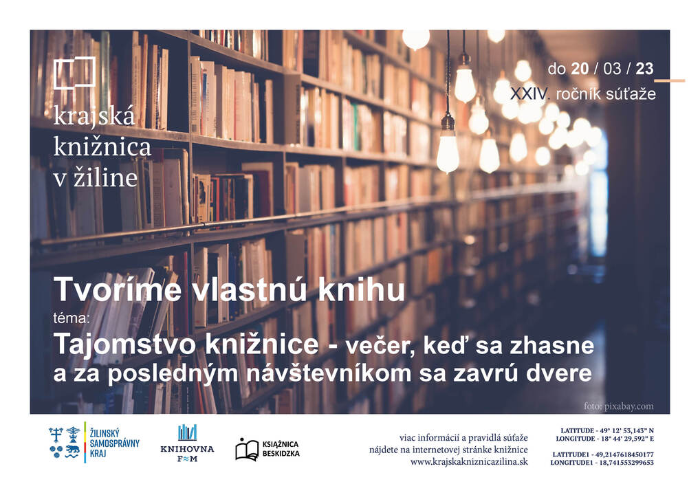 Krajská knižnica v Žiline, organizácia v zriaďovateľskej pôsobnosti Žilinského samosprávneho kraja vyhlasuje XXIV. ročník medzinárodnej slovensko-česko-poľskej súťaže TVORÍME VLASTNÚ KNIHU (národné kolo).