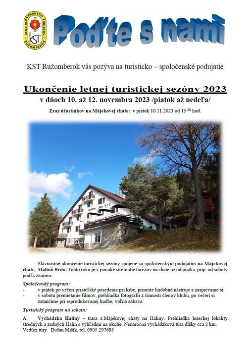 Klub slovenských turistov Ružomberok vás pozýva na tradičné ukončenie letnej turistickej sezóny 2023 na Májekovej chate.