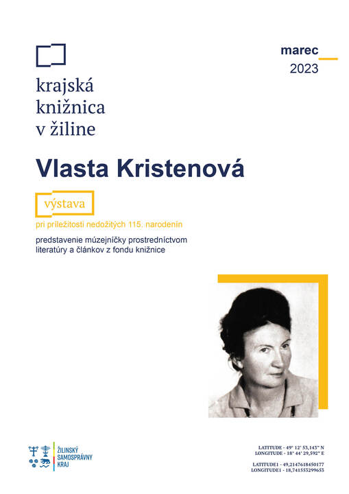 Predstavíme Vám život a tvorbu osobnosti v periodikách, knihách a zborníkoch pri príležitosti nedožitých 115. narodenín. Vlasta Kristenová bola priekopníčka moderného slovenského múzejníctva, zanietená výskumníčka staršej histórie oblasti Žiliny, organizátorka vlastivednej činnosti v širšej verejnosti v meste Žilina i na severozápadnom Slovensku, iniciátorka vydávania vlastivedného periodika pre túto oblasť i spolupráce s múzeami, archívmi, knižnicami a ďalšími kultúrnymi zariadeniami v regióne. Výstavu si môžete prísť pozrieť od 4. marca do Krajskej knižnice v Žiline.
