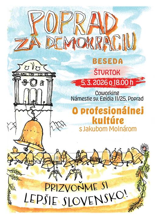 Občianska platforma Poprad za demokraciu pozýva na besedu: O profesionálnej kultúre. Aké je to byť profesionálnym umelcom? Je to skutočne bohémsky život, plný slávy, úspechu a peňazí? Pozrieme sa hlbšie nielen do divadelného sveta, povieme si aké problémy musia riešiť profesionálni umelci a čo všetko stojí za umeleckým zážitkom. Rozprávať sa budeme s Jakubom Molnárom, ktorý pôsobí v Divadle Jána Palárika v Trnave a Divadle Husa na Provázku v Brne.