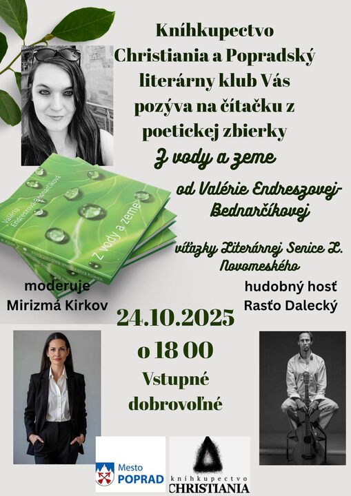 Popradský literárny klub a kníhkupectvo Christiania pozýva na literárny večer, kde bude predstavená debutová zbierka básní Valérie Endreszovej-Bednarčíkovej: Z vody a zeme.