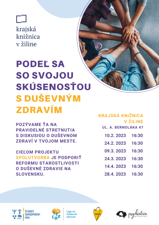 Liga za duševné zdravie – Podeľte sa s vašou skúsenosťou s duševným zdravím. Pozývame vás na pravidelné stretnutia s diskusiou o duševnom zdraví, dvakrát do mesiaca v Krajskej knižnici v Žiline. Cieľom projektu je podporiť starostlivosť o duševné zdravie na Slovensku. Termíny stretnutí sú: