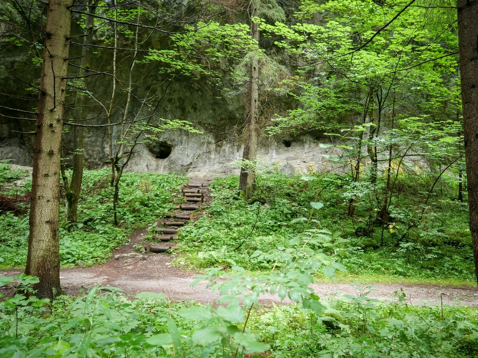 V hustejšej časti lesa sa znovu vynárajú skalné útvary, ktorým výrazne dominuje obrovský previs na východnej strane chodníka. Trasa pokračuje popri množstve skalných útvarov ďalej popri potoku. V jednej zo skál hneď vedľa chodníka je výrazná priehlbina a o kúsok južnejšie prechádza chodník v zúženom mieste popri skale dreveným mostíkom ponad vodu. V tomto mieste je voda hlboká a priezračná. Most je naklonený smerom k potoku a opatrený je zábradlím. Malá štrková plocha na brehu je vhodná ako ,,pláž pre otužilcov“ a kto má odvahu môže sa aj trochu namočiť. Kúsok za nahnutým mostom pretína chodník doslova rozprávkový malý prítok nazývaný Prameň pod studenou dierou. Pri troche fantázie a správnych svetelných podmienkach sa tu dajú kľudne zbadať čarovné lesné bytosti. Na tomto mieste je umiestnená lavička s príbehom umiestneným priamo na operadle.