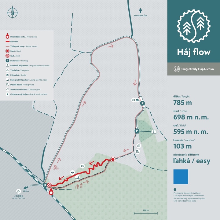 Štart flowtrailu je situovaný na konci lúky vedľa vojenského pamätníka a je viditeľne označený drevenou bránou a orientačnými tabuľkami. Výstupová trasa na bicykli je vedená po oficiálnej asfaltovej ceste na Háj-Nicovô, prípadne je možné bicykel vytlačiť po turistickom pešom chodníku po pravej strane trailu.