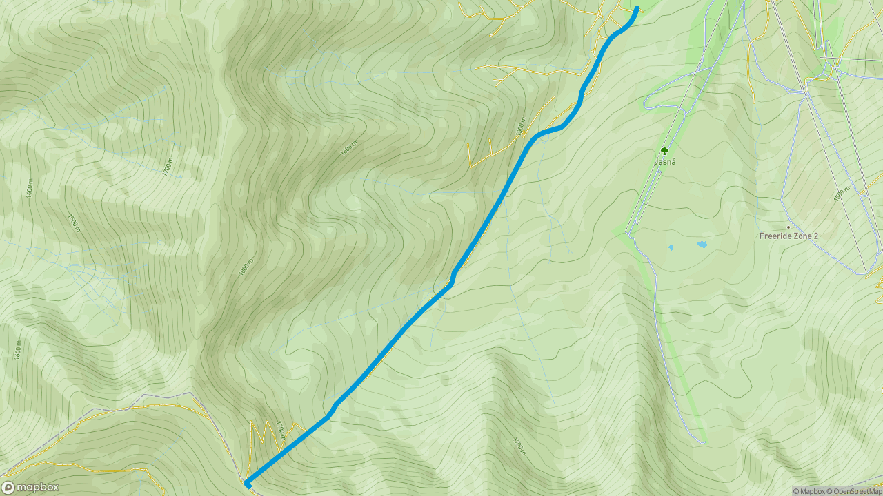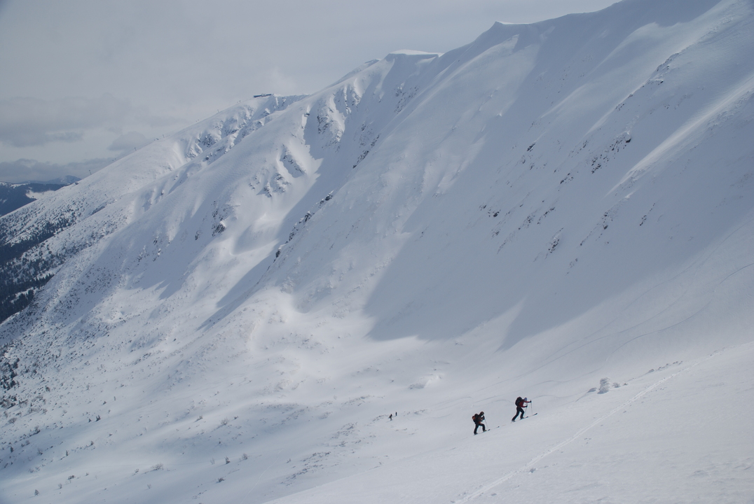 The route starts in Jasná. It is most often possible to go up on skins from the Marmot Hotel (formerly Šverma). The route leads through the valley of Zadná voda, copying the yellow trail marking mostly. A wide forest path gradually alternates sidewalk. It is steep in places and crosses the stream several times. The more snow, the easier the ascent. About three kilometers later, the path leads to the narrow valley, the forest slowly turns sparse and the views of Dereše, Poľana Saddle and Bory appear. The route continues through a wide wold, which gets gradually steeper and continues directly into the Saddle. In the upper parts of the ascent, the inclination exceeds 30°. The direct track up at this point is already alternated by ski mountaineering turns, the so-called zigzags. The ridge and the section just below it are often wind-blown onto a hard surface, so in the case of bad conditions it is necessary to use crampons. In terms of avalanches, the last section is the most dangerous, because it is the steepest. The summit is a large platform, suitable for walking, but it is often windy here.